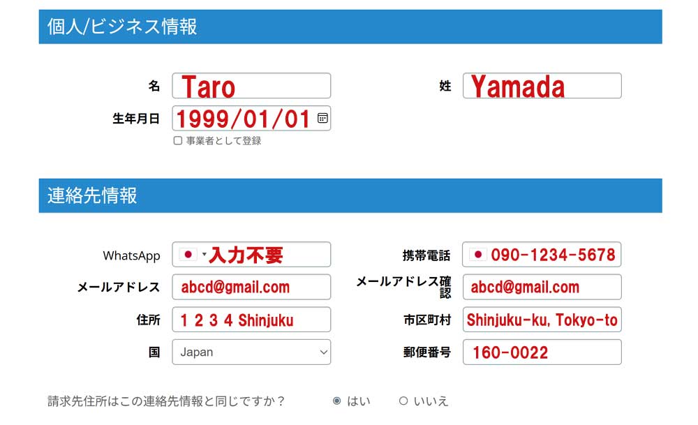 ⑤個人情報の入力をします。(※全てローマ字で入力)